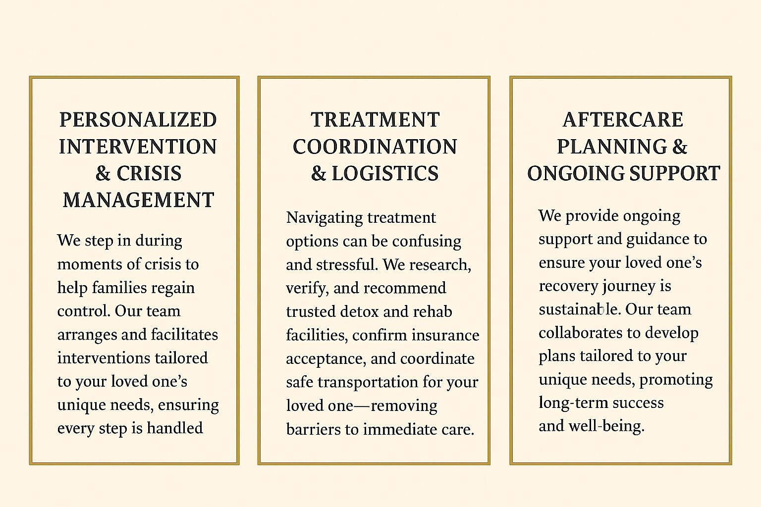 As a private consulting service, we manage the critical details—verifying treatment centers and insurance coverage, arranging interventions, securing safe transportation to detox or rehab, and connecting clients with trusted aftercare resources. Our mission is to provide comprehensive support, so families can focus on healing while knowing their loved one’s next steps are in expert hands.